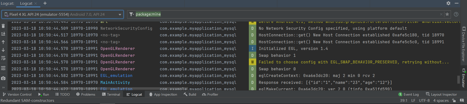 Log.d("MainActivity", "Response received: $response") 是在 Response.Listener 回调函数中添加的,所以它的 TAG 是 “MainActivity”,输出的是 “Response received” 字符串和响应的内容。